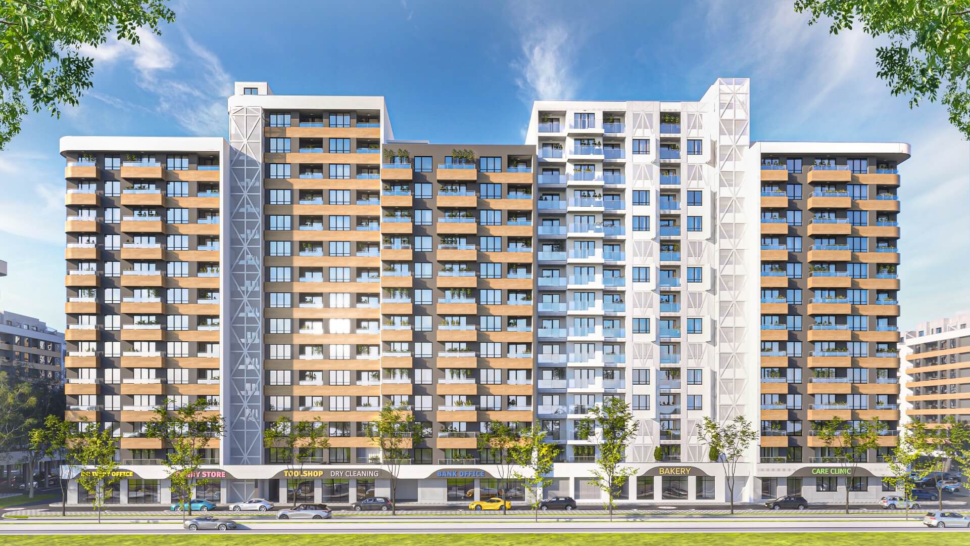 Просторният комплекс разполага с пет входа, всеки от които е оборудван с удобни, високоскоростни асансьори. В строителството са използвани съвременни технологии и материали, които намаляват разходите за енергия и осигуряват максимален комфорт през цялата година. На партерния етаж са разположени търговски площи, включително офиси, химическо чистене, магазин, пицария, медицински кабинет и бистро. На партерния етаж са разположени и апартаменти. Предлагат се студиа, двустайни и тристайни апартаменти с площ от 41 до 113 квадратни метра. Целият комплекс е зелена зона без автомобили. Подземният паркинг е подходящ за различни видове превозни средства, както и за електрически превозни средства и велосипеди. Обширните удобства на място включват спа център със закрит басейн, медицински център и зони за релакс. Premier Realty Master предлага най-добрата оферта за нови имоти на брега на морето в България. Ще ви помогнем да изберете най-подходящия вариант, ще ви преведем през сделката и ще се погрижим за всички правни въпроси.