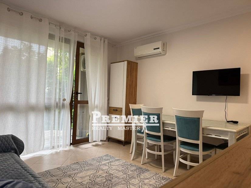Продава се студио в затворен комплекс. Апартаментът се намира на партерния етаж и е с площ от 34 квадратни метра. Предлага се обзаведен и оборудван. Този луксозен затворен комплекс е един от най-известните в Слънчев бряг. На 700 метра от плажа. Комплексът разполага с 9 открити басейна, барове, ресторанти, уелнес спа център, фитнес център, тематичен екопарк с кино, мини аквапаркове, магазини, зони за отдих с барбекюта и пекарна. Осигурени са охрана и паркинг. Комплексът се гордее с обширна терито...