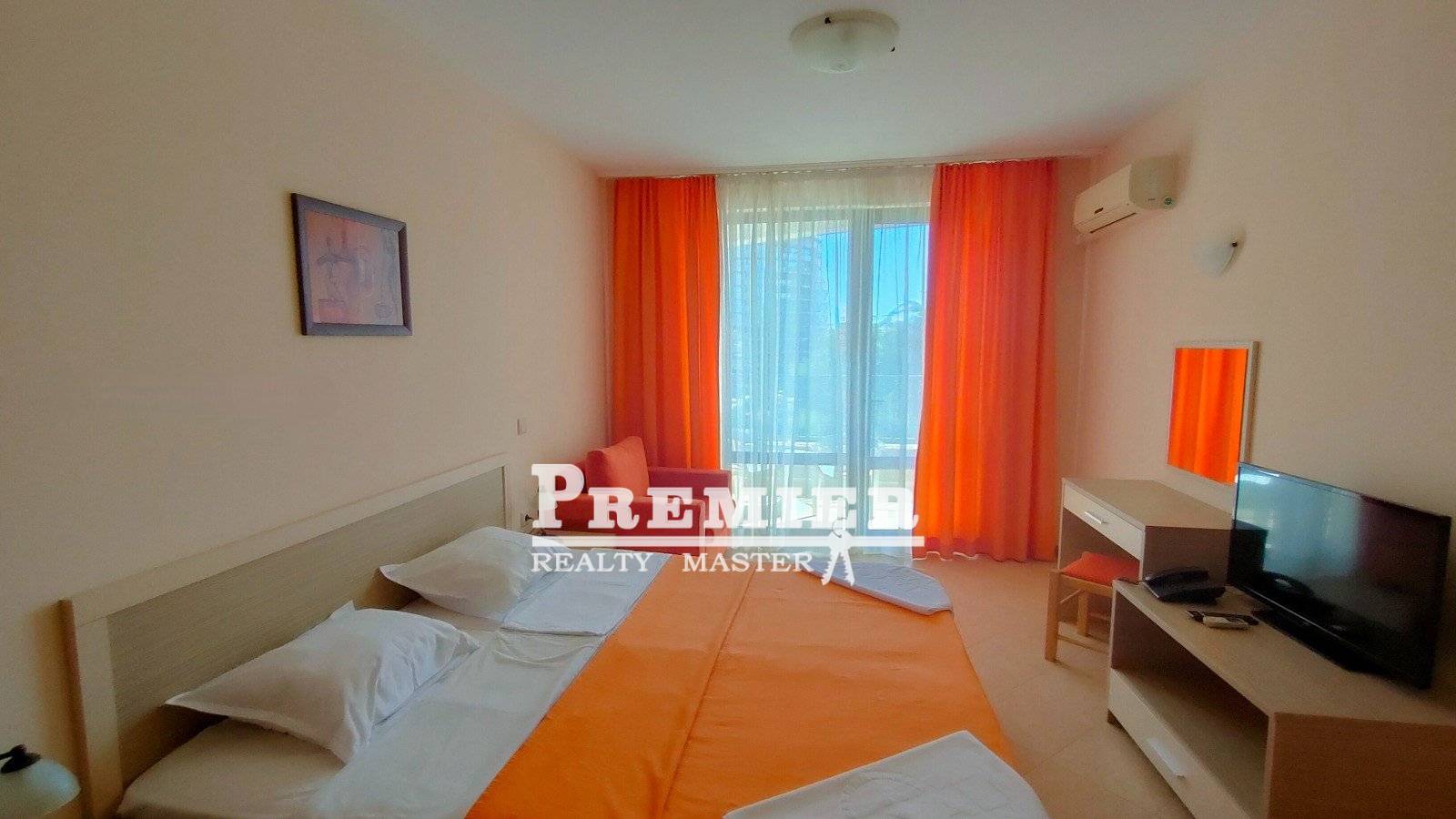 Продава се Едностаен голям апартамент в луксозен комплекс, в централната част на курорта, с добре поддържана и озеленена територия. Апартаментът е с обща площ 43 кв. м.и се намира на 4-ти етаж в 6-етажна тухлена сграда с асансьор. Изложение: Изток. Функционално разпределение: антре, просторна всекидневна с кухненски бокс, баня с вана и тоалетна, тераса с изглед към градината. Апартаментът се продава напълно обзаведен: с удобно голямо легло и разтегателен фотьойл, маса със столове, гардероб, хлад...
